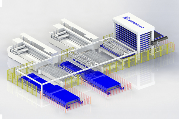 自动化上下料系统+自动切割系统又可以和前端的自动料库系统、后端的AGV物流系统、自动折弯系统、自动焊接系统,乃至后续的表面处理系统结合成全自动化的钣金生产线。
